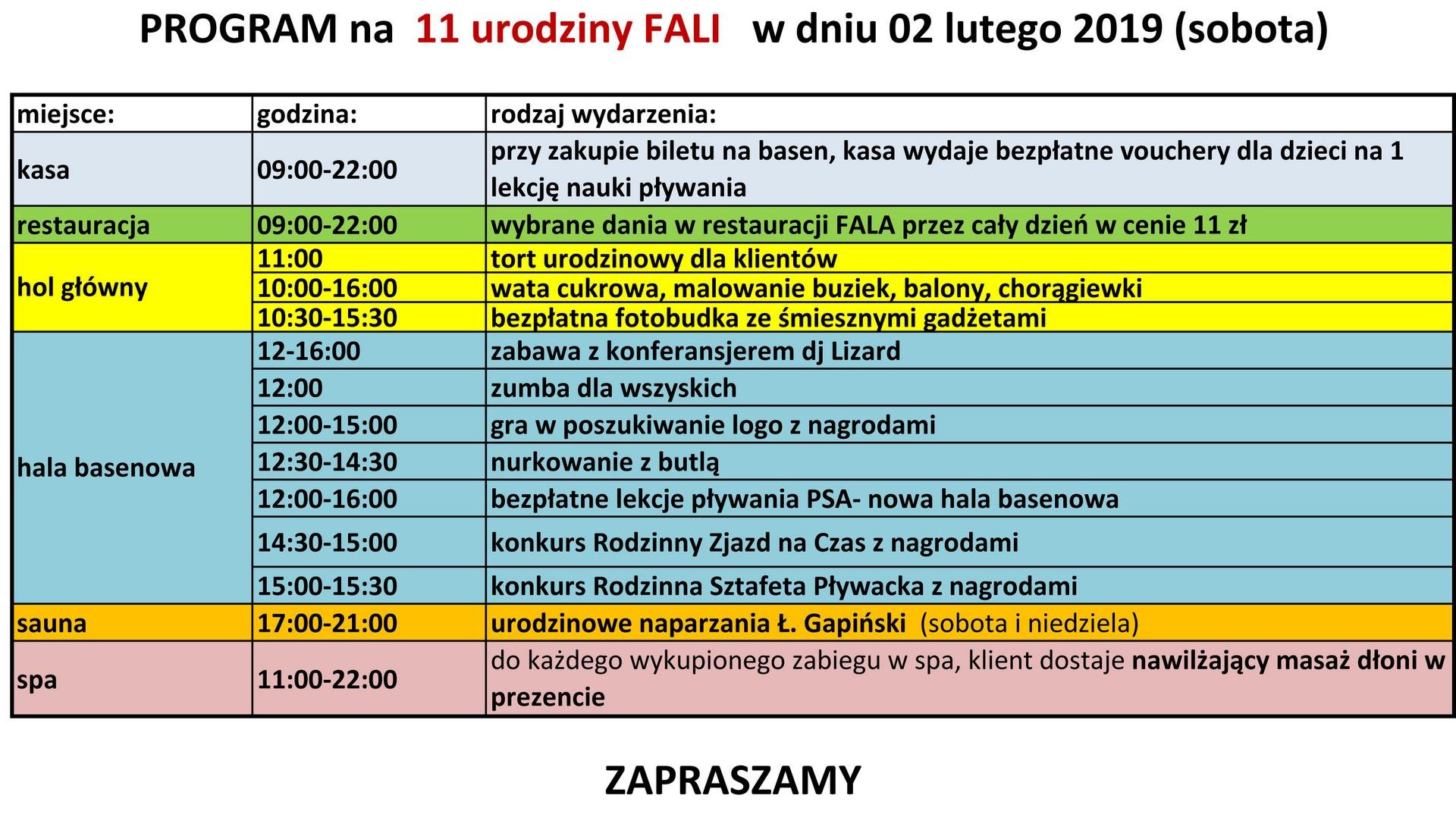 Z okazji swoich 11 urodzin Aquapark Fala zaprasza łodzian do wspólnego świętowania. Urodzinowa sobota na Fali rozpocznie się o godz. 11 lampką bezalkoholowego szampana i porcją pysznego tortu. Później na gości czeka szereg atrakcji, zarówno dla dzieci, jak i dorosłych. Będą konkursy z nagrodami, w tym bardzo lubiany przez łodzian „Rodzinny zjazd na czas” oraz „Rodzinna sztafeta pływacka”. Dla chętnych będą też kursy zumby, nurkowania z butlą, nauki pływania oraz malowanie buziek. Będzie też fotobudka, kolorowe balony i wata cukrowa. Z okazji 11. urodzin Aquaparku Fala każde dziecko wchodzące na basen dostanie przy kasie bezpłatny voucher na 1-godzinną lekcję pływania. Wybrane dania w restauracji Fala będą tego dnia kosztowały tylko 11 zł.