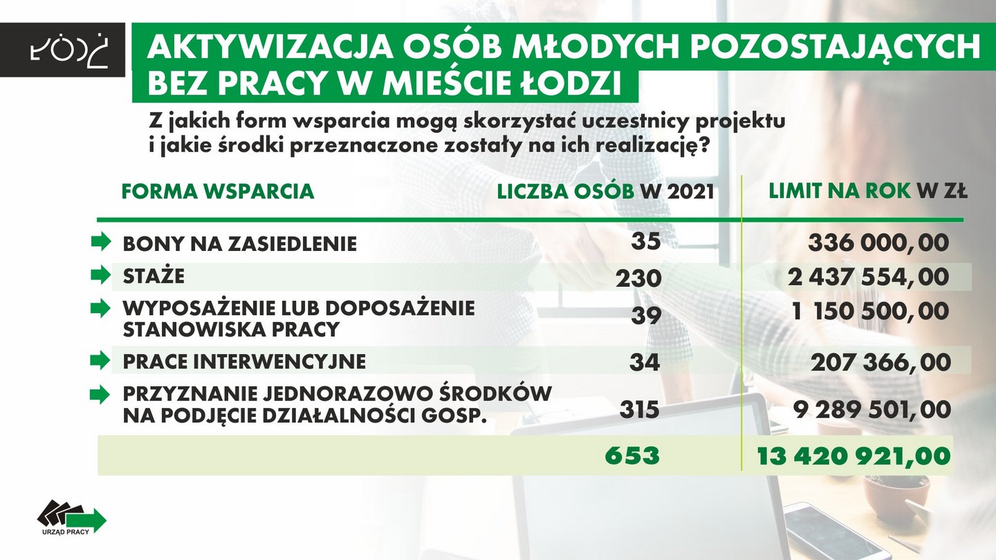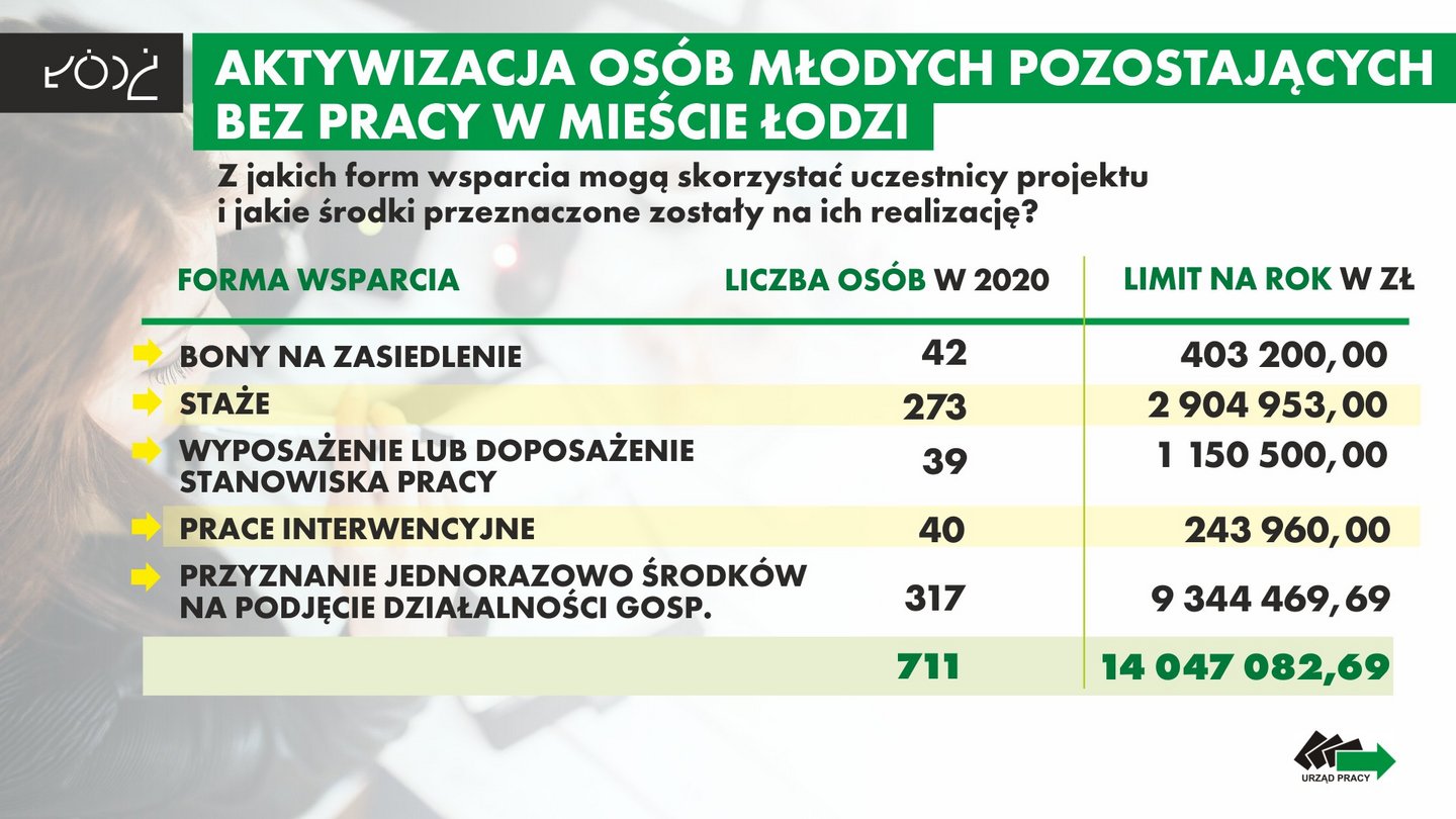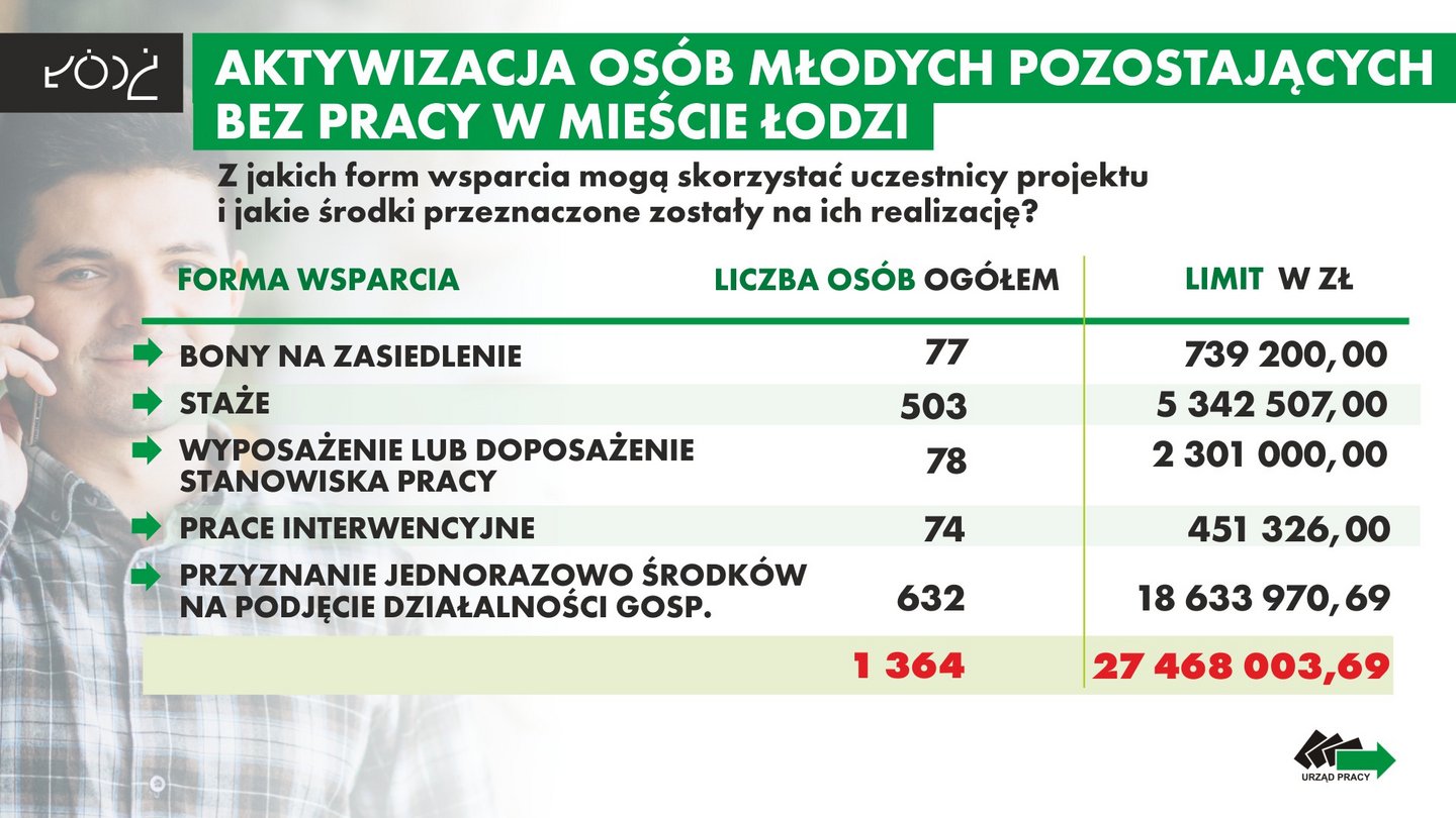 Jak poinformował Piotr Bors, dyrektor Biura Promocji Zatrudnienia i Obsługi Działalności Gospodarczej UMŁ, projekt skierowany do osób poniżej 30 roku życia obejmuje różne formy wsparcia. Jedna droga to rozpoczęcie własnej działalności gospodarczej przy pomocy finansowej na poziomie ok. 30 tys. zł. Ponadto w grę wchodzą również płatne staże, wyposażanie lub doposażenie stanowisk pracy, prace interwencyjne, czy bony na zasiedlenie.