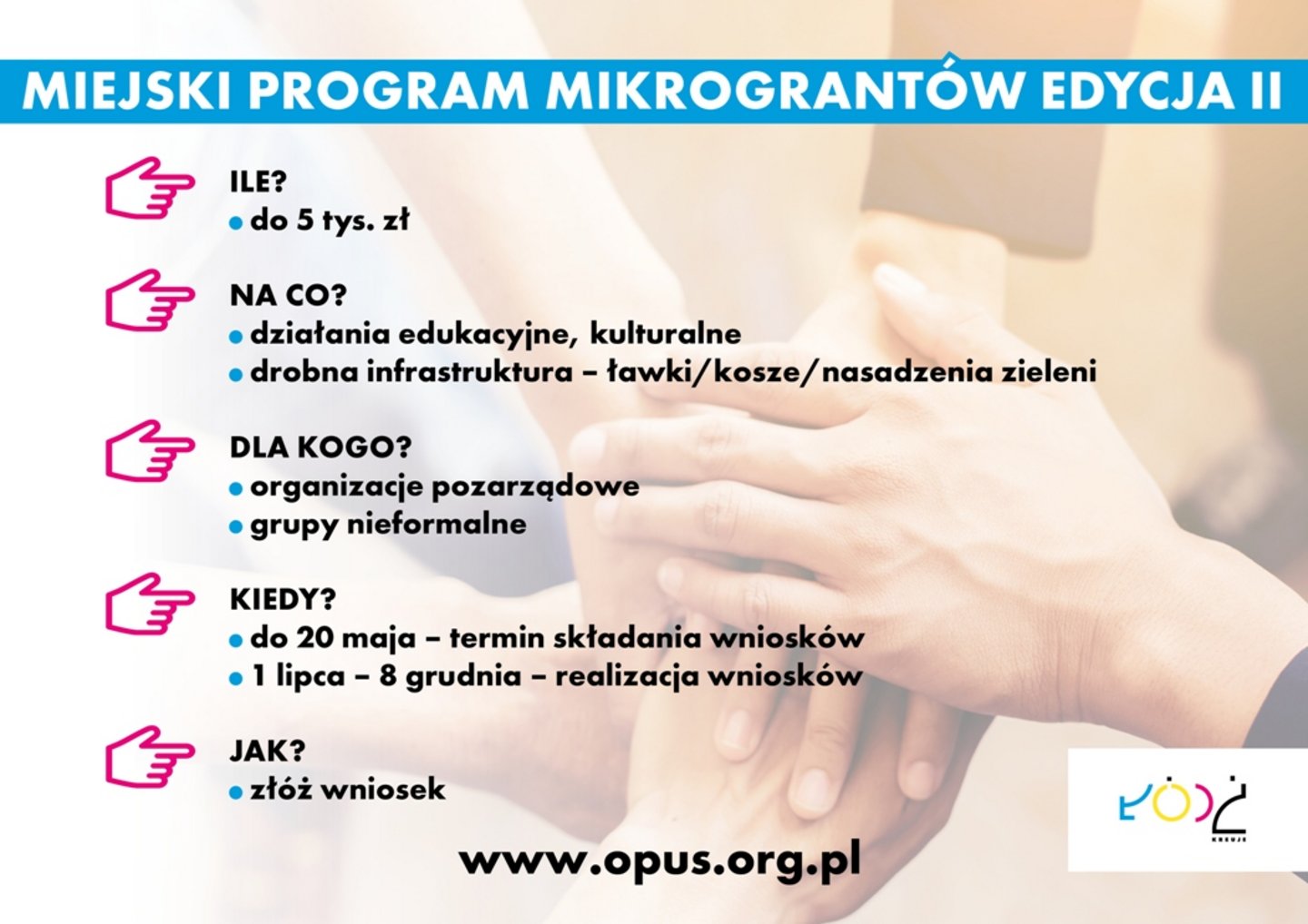 Dzięki Mikrograntom można realizować i sfinansować małe, lokalne inicjatywy takie jak: szkolenia, pikniki, warsztaty, drobne inwestycje np. ławki i nasadzenia zieleni. W ramach Miejskiego Programu Mikrograntów o dotację mogą ubiegać się łodzianie oraz lokalne organizacje pozarządowe. Wysokość dotacji wynosi od 500 do 5.000 zł. W 2019 r. do rozdysponowania na małe projekty łodzian jest 180 tys. zł, z czego 160 tys. pochodzi z budżetu miasta, a 20 z Funduszu Inicjatyw Obywatelskich i własnych środków Centrum Opus, które jest operatorem tego zadania.
