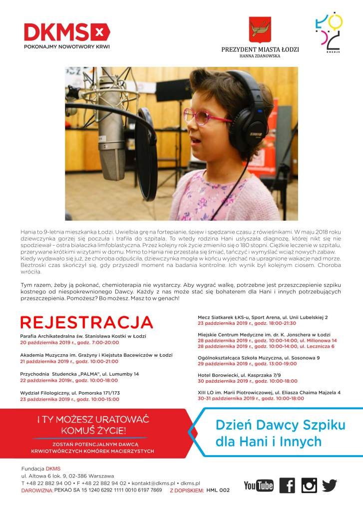 - Mocno ściskam kciuki za zdrowie i życie Hani, przebywającej w tej chwili w szpitalu przy Spornej. Rozpoczynamy szeroko zakrojoną akcję rejestracji potencjalnych dawców. Między 20 a 31 października ogłaszamy w Łodzi Dzień Dawcy Szpiku dla Hani i Innych. W ramach działań promocyjnych na ulicach Łodzi zawiśnie ponad 1500 plakatów, będą malowanki dla najmłodszych oraz komunikaty w miejskiej komunikacji. Z całego serca zapraszam wszystkich łodzian do zaangażowania. Dzielmy się tym, co najcenniejsze. Zawalczmy o życie Hani! Możemy to zrobić - mówi prezydent Łodzi Hanna Zdanowska.