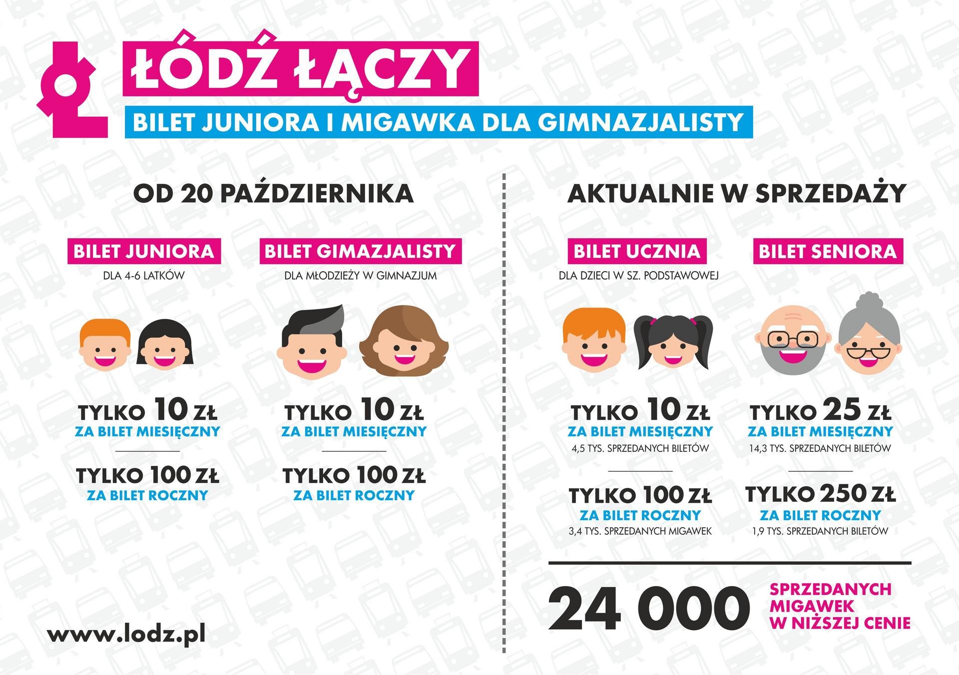 Miesięczny koszt obu migawek to 10 złotych, bilet roczny to wydatek 100 złotych. Bilet dla przedszkolaka i migawkę dla gimnazjalisty będzie można kupić już od 20 października br. Ważne będą z legitymacją szkolną lub z dokumentem potwierdzającym wiek dziecka. - Rozszerzenie taryf to spełnienie próśb mieszkańców Łodzi. Ważny jest również edukacyjny aspekt oferty. Chcemy zachęcić do podróżowania komunikacją miejską. Wprowadzone we wrześniu ulgowe migawki dla uczniów szkół podstawowych i seniorów cieszą się ogromną popularnością. Do tej pory sprzedano ich 24 tysiące - powiedział Michał Chylak, zastępca dyrektora Zarządu Dróg i Transportu w Łodzi.
