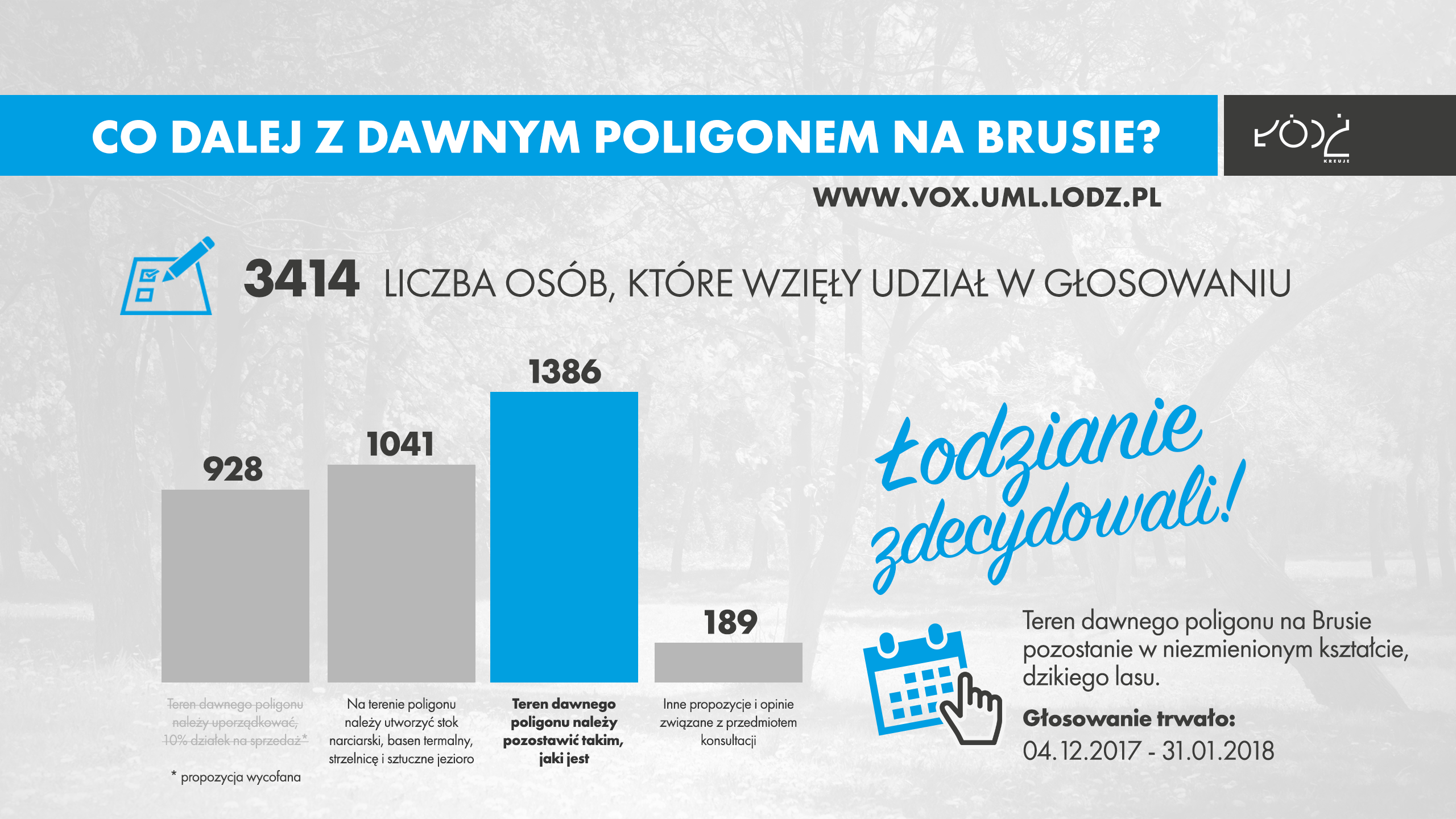 Rozstrzygnięte zostały konsultacje, w których łodzianie mieli zdecydować o tym, co dalej z dawnym poligonem na Brusie. W głosowaniu na platformie internetowej Vox Populi wzięło udział 3414 mieszkańców. Przeważająca ich część, 1386 osób, zagłosowało, by teren dawnego poligonu zostawić takim jaki jest. Inne koncepcje zyskały mniej głosów poparcia.