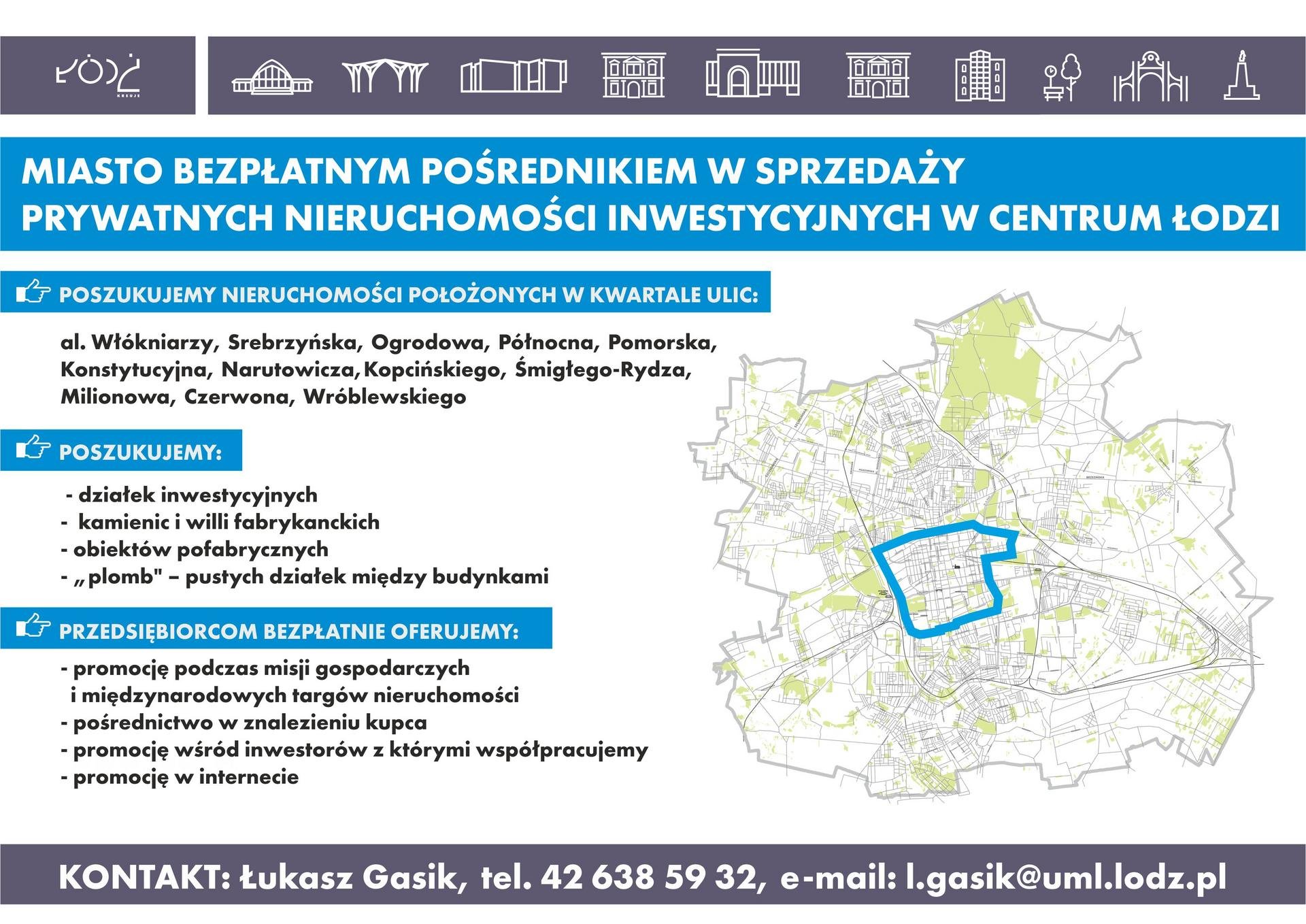 Biuro Rozwoju Gospodarczego i Współpracy Międzynarodowej UMŁ poszukuje ofert nieruchomości do sprzedaży położonych w kwartale ulic: al. Włókniarzy, Srebrzyńska, Ogrodowa, Północna, Pomorska, Konstytucyjna, Narutowicza, Kopcińskiego, Śmigłego-Rydza, Milionowa, Czerwona, Wróblewskiego. Oferta pośrednictwa dotyczy: działek (zabudowanych i niezabudowanych), kamienic, pałaców, obiektów pofabrycznych i pustych działek pomiędzy budynkami w zabudowie pierzejowej (tzw. plomb).