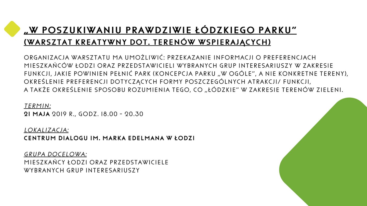 • 21 maja w Centrum Dialogu przewidziano również specjalny warsztat kreatywny pod hasłem "W poszukiwaniu prawdziwie łódzkiego parku".
