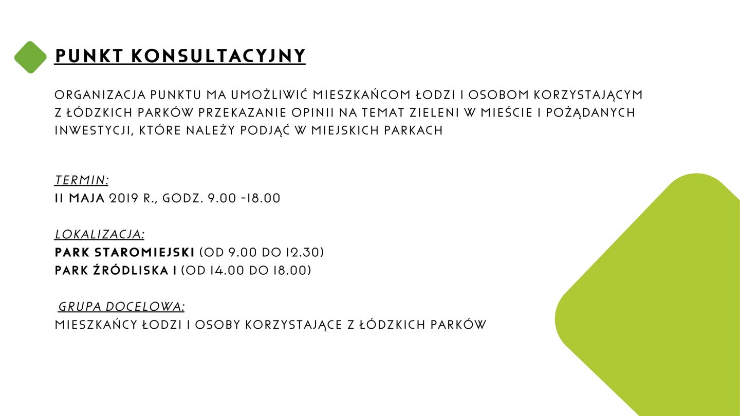 • Punkty konsultacyjne dla mieszkańców staną już w sobotę (11 maja) w parku Staromiejskim (godz. 9-12.30) oraz w parku Źródliska (godz. 14-18).