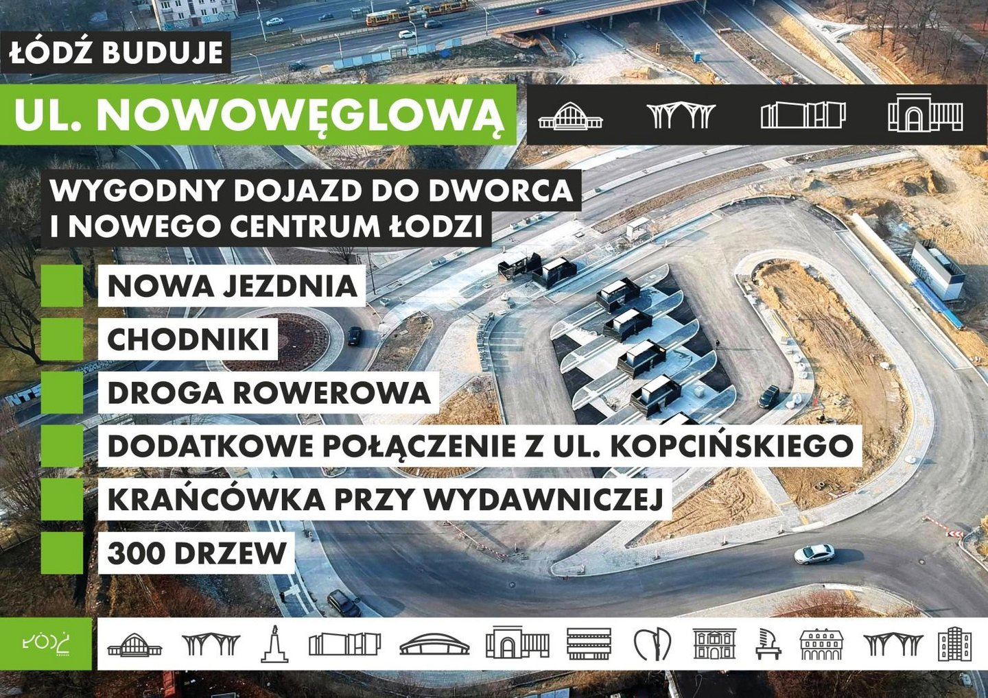 Ulica Nowowęglowa powstała dokładnie nad tunelem kolejowym, którym pociągi dojeżdżają do podziemnej stacji Łódź Fabryczna. W ramach inwestycji powstały też specjalne łączniki, które umożliwią wjazd na ulicę Kopcińskiego. Przy ul. Wydawniczej powstała nowa krańcówka z siedmioma stanowiskami dla autobusów. Ustawiono tam także nowe wiaty oraz ławki. Przebudowany zostanie także fragment ulicy Tuwima. Pojawi się także dużo zieleni. Zasadzonych ma zostać blisko 300 drzew oraz 4,5 tys. krzewów.