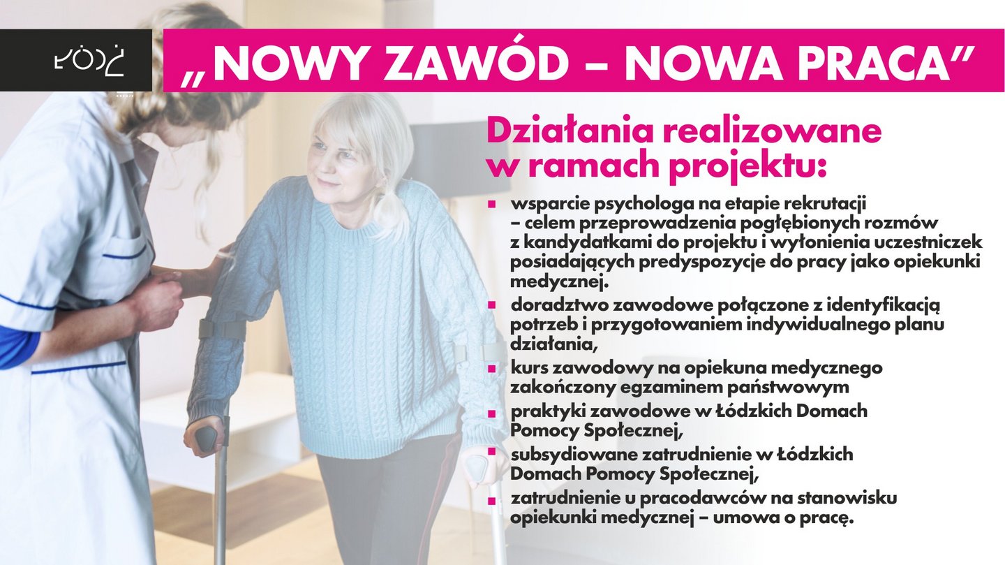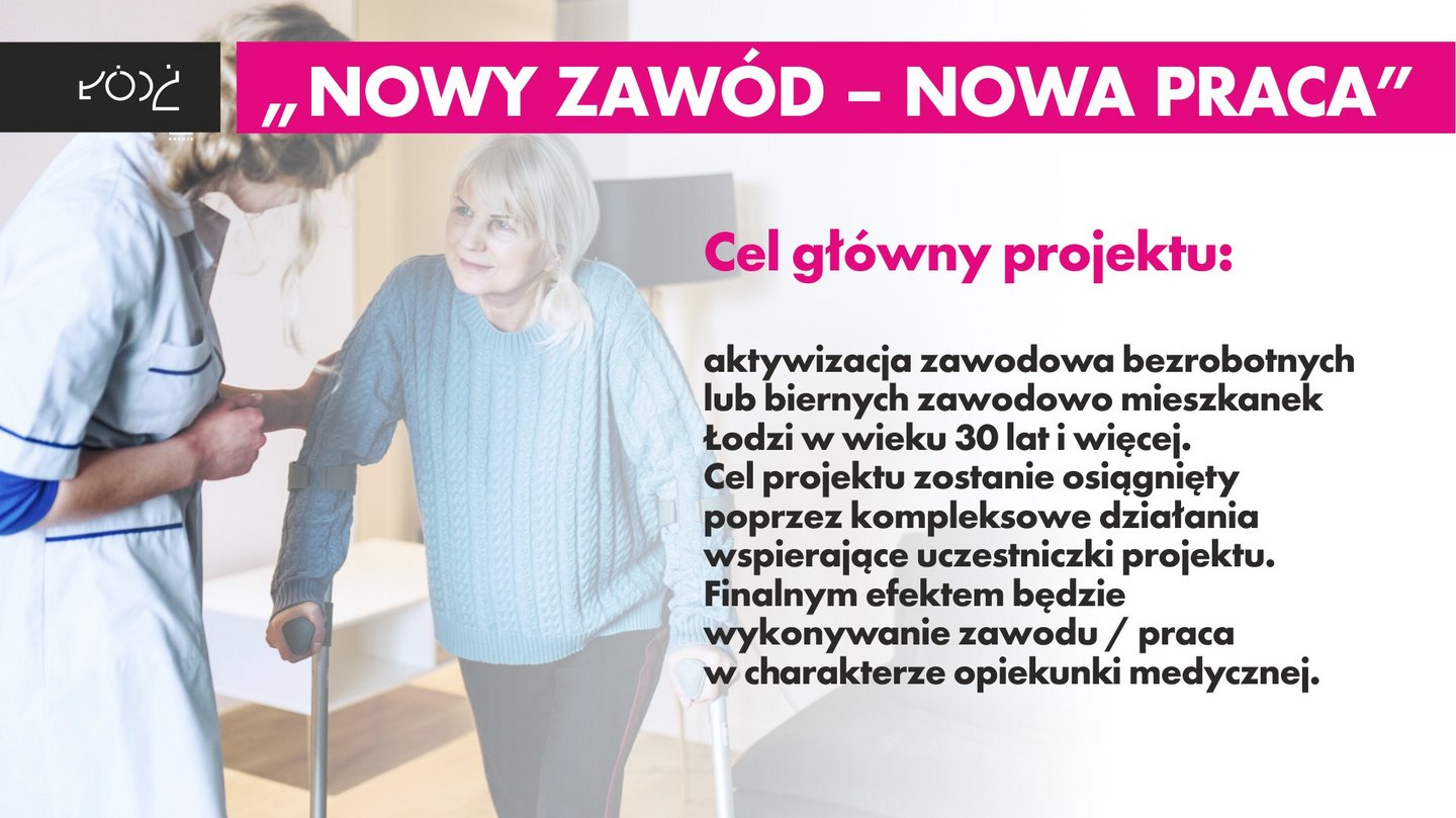 Cel główny projektu: aktywizacja zawodowa bezrobotnych lub biernych zawodowo mieszkanek Łodzi w wieku 30 lat i więcej. Cel projektu zostanie osiągnięty poprzez kompleksowe działania wspierające uczestniczki projektu. Finalnym efektem będzie wykonywanie zawodu / praca w charakterze opiekunki medycznej.