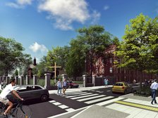 • kreacja przestrzeni publicznej z funkcją ciągu pieszego miedzy ulicami tego przebicia obejmująca m.in. budowę fontanny i posadzenie 40 dużych drzew,