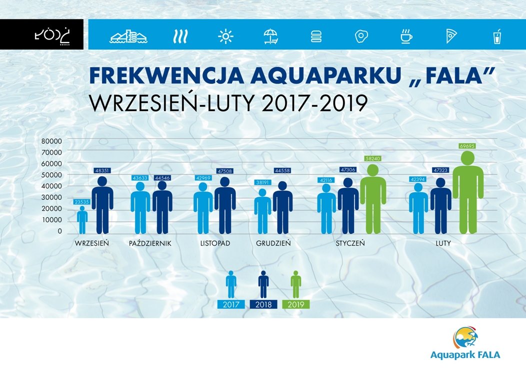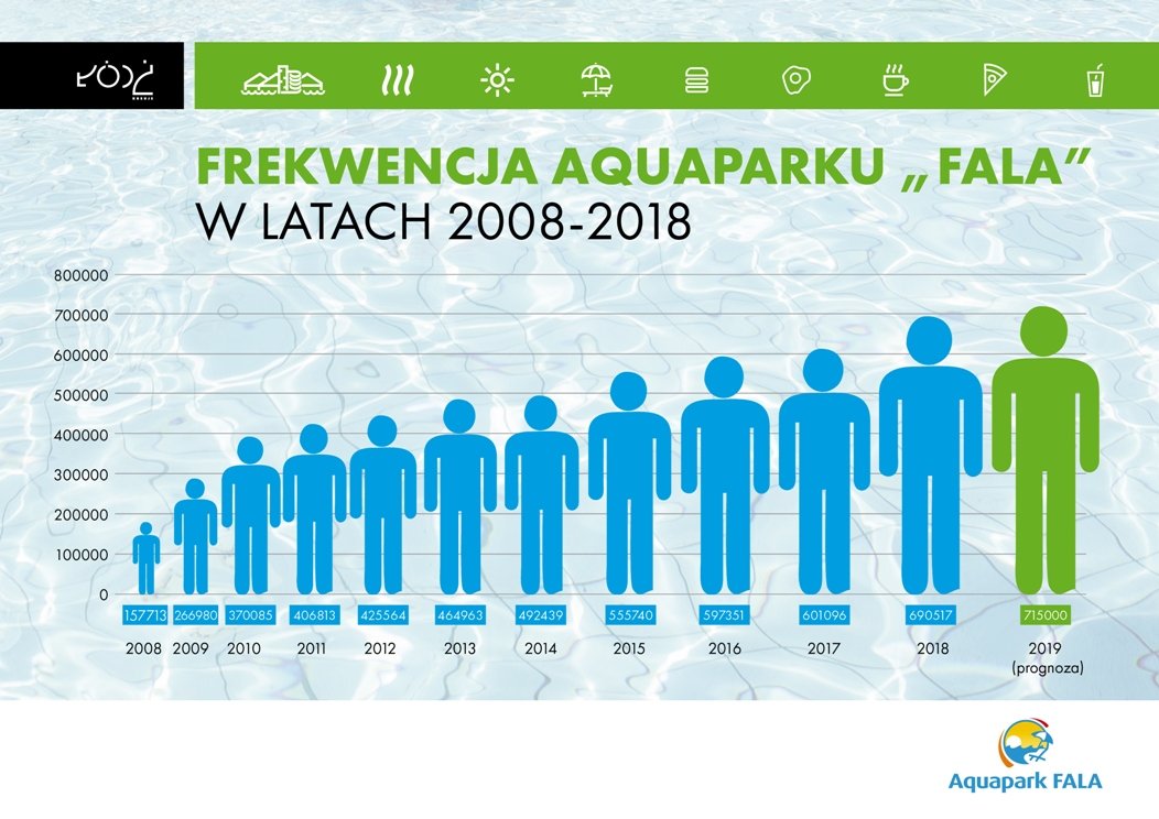 Z roku na rok Aquapark Fala notuje wzrost frekwencji, która wskazuje popularność obiektu w regionie łódzkim. Przyczyniły się do tego między innymi inwestycje: nowa hala z basenem sportowym, całoroczny podgrzewany basen zewnętrzny, jacuzzi, solanki z solą z Morza Martwego, Bocheńską i Epsom oraz sauna zewnętrzna o powierzchni 60 m2, a także basen wody zimnej w strefie saun.