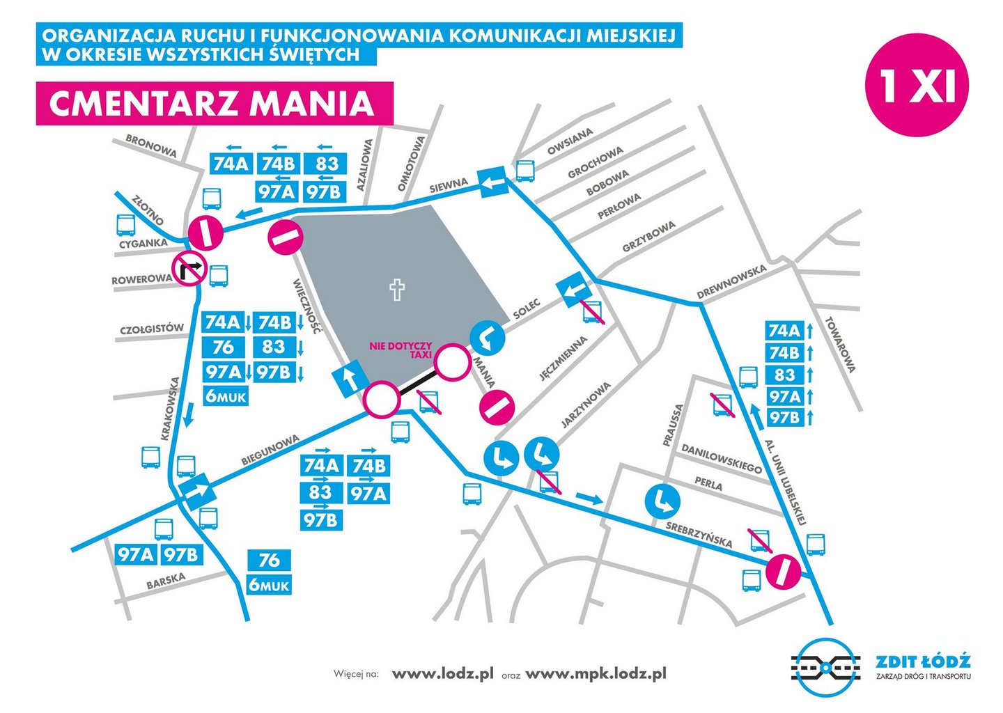 • Linie 97A i 97B zmienią trasę przy cmentarzu Mania. Z pętli Dw. Łódź Kaliska do skrzyżowania Konstantynowska - Unii Lubelskiej dojadą bez zmian, a następnie Unii Lubelskiej, Solec, Borową, Siewną i Krakowską do Biegunowej gdzie wrócą na swoją trasę.