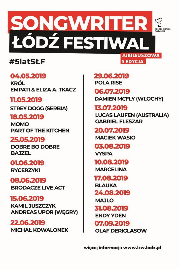 Tegoroczny koncert otwarcia Songwriter Łódź Festiwal odbędzie się 4.05.2019 (sobota) o godzinie 20 na skrzyżowaniu ul. Piotrkowskiej i 6 Sierpnia w Łodzi. Zaprezentuje się trzech artystów: Król, czyli Błażej Król, jeden z najbardziej utytułowanych muzyków i tekściarzy młodego pokolenia oraz łódzcy muzycy: Empati wraz z Elizą A. Tkacz.