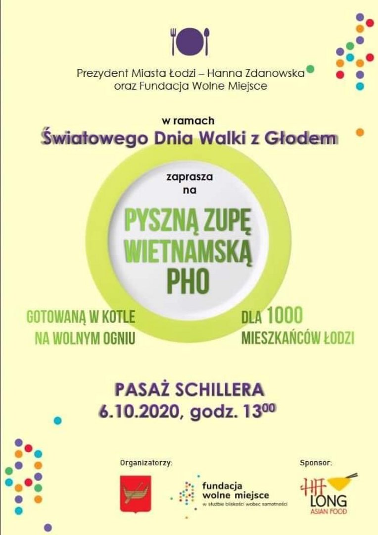 6 października z okazji Światowego Dnia Walki z Głodem tysiąc potrzebujących łodzian będzie mogło zjeść w pasażu Schillera - jak przed rokiem - zupę Pho ugotowaną przez łódzkich restauratorów.