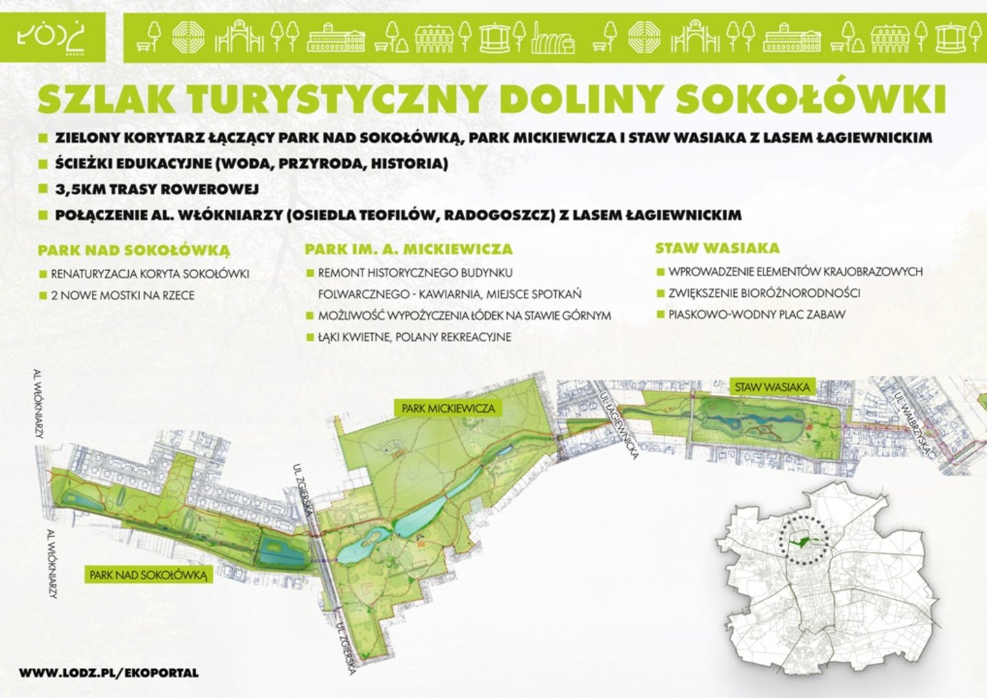 Prezydent Łodzi Hanna Zdanowska mówi: - Sokołówka to jedyna rzeka, która nie została włączona przed laty w system miejskiej kanalizacji. Dzięki swojemu położeniu poza centrum, wije się głównie zielonymi terenami, od okolic Lasu Łagiewnickiego do zachodnich rogatek Łodzi. Chcemy wydobyć jej potencjał, dlatego w dolinie rzeki planujemy utworzyć szlak pieszo-rowerowy ze ścieżkami edukacyjnymi i punktami obserwacji przyrody. Uzupełniając łącznikami trzy parki i zieleńce, planujemy stworzyć trasę do spacerowania pośród zieleni, wzdłuż rzeki i brzegami stawów.