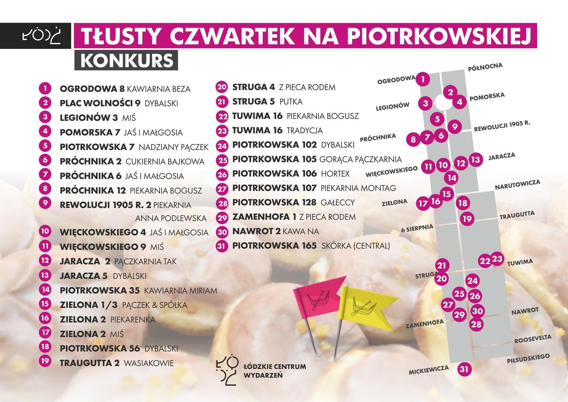 W deptakowej części ul. Piotrkowskiej znaleźć można ponad 30 punktów oferujących pączki. Od 2017 r. otworzyły się 4 pączkarnie i kilka nowych cukierni, zamknięto zaś punkt ogólnopolskiej marki sklepików z pączkami, który mieścił się przy Piotrkowskiej 35. Chwilę później w bramie pod tym numerem pojawiła się nowa kawiarnia, która na tegoroczny Tłusty Czwartek przygotowała pączki pieczone na słodko i… wytrawnie. Wyroby zakładów i kawiarni z wieloletnią tradycją cukierniczą nie tracą na zainteresowaniu, ale łodzianie lubią także innowacje, np. pączki wegańskie albo bezglutenowe. Coraz chętniej swoich sił w samodzielnej produkcji tych słodkości próbują kolejne kawiarnie, a nawet restauracje.