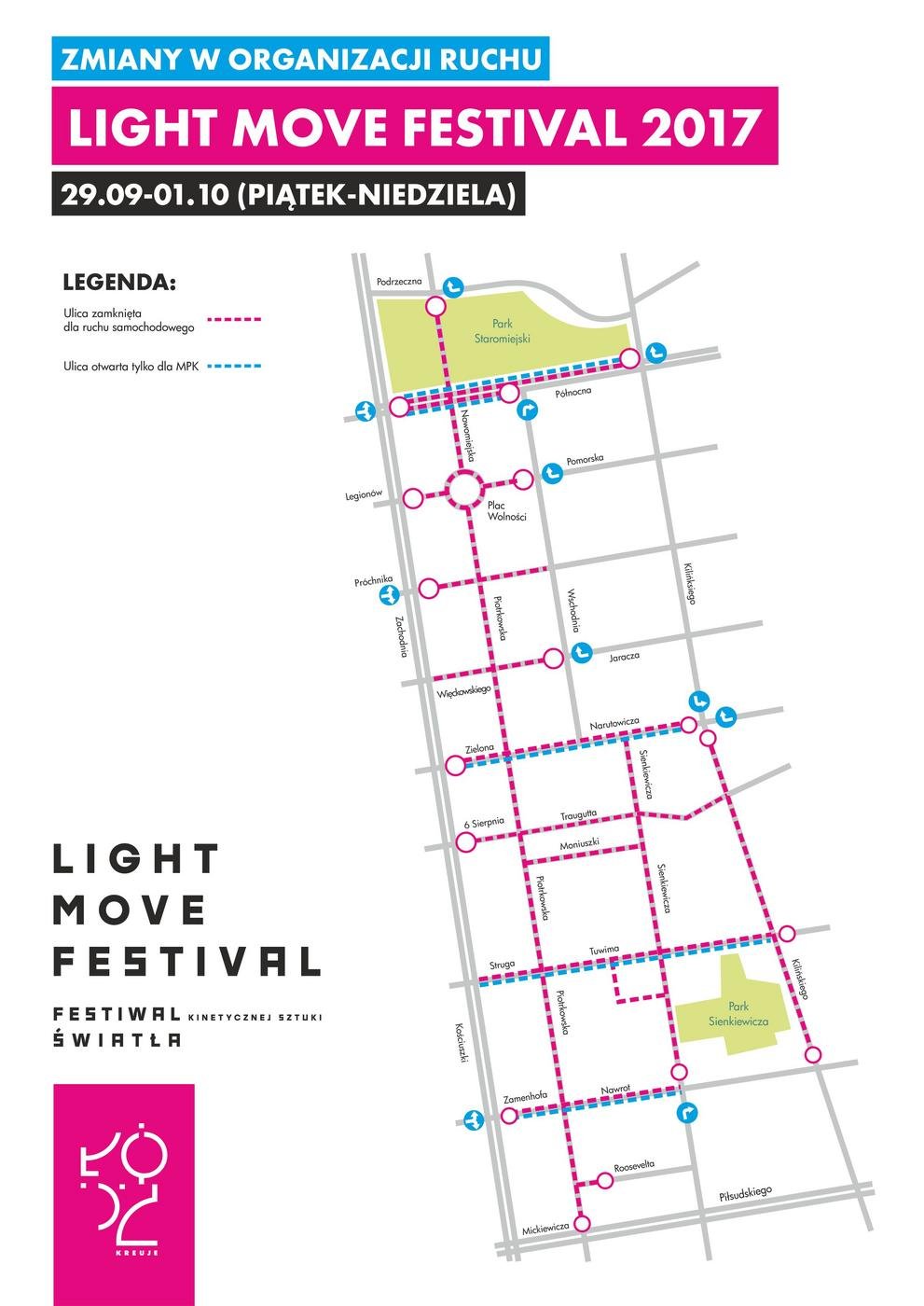 Tegoroczna edycja Light.Move.Festival odbędzie się od 29 września do 1 października. Festiwal jak zwykle obejmie ścisłe centrum miasta. Aby zapewnić bezpieczeństwo część ulic zostanie zamknięta dla samochodów. Zachęcamy do wybrania dojazdu komunikacją miejską, która w tych dniach będzie szczególnie uprzywilejowana.  Ponadto przypominamy, że ze względu na dużą frekwencję i możliwy tłok na tej imprezie, nie należy zabierać ze sobą dużych toreb czy plecaków, ostrych narzędzi oraz materiałów typu race czy petardy.