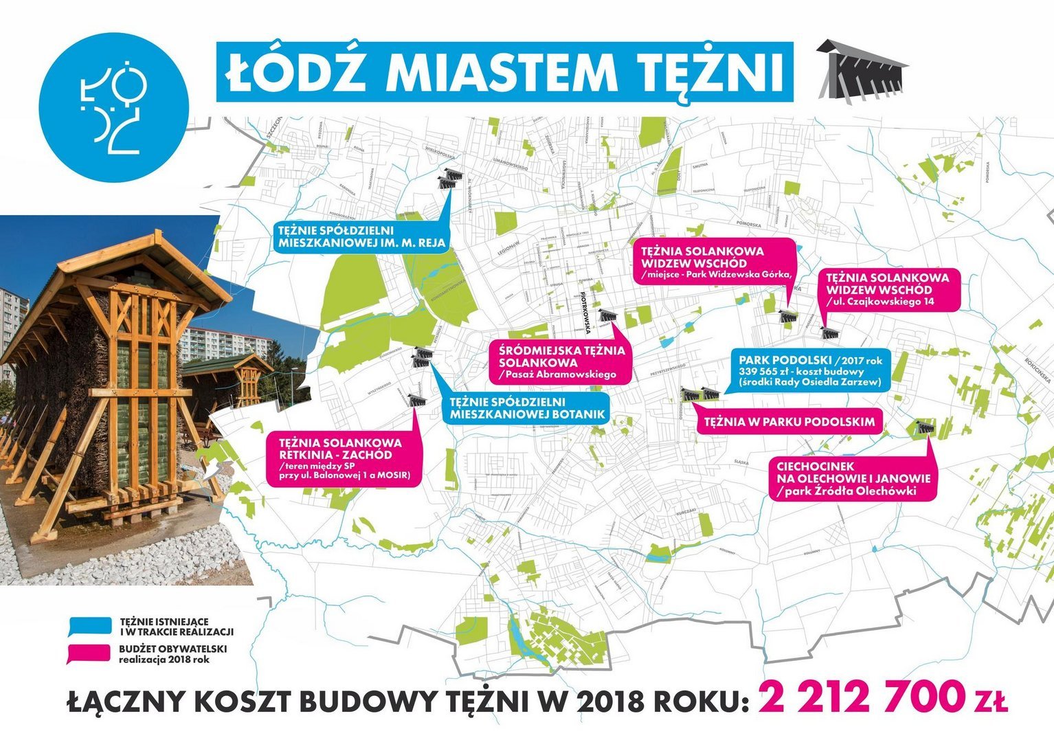 Obecnie w Łodzi są cztery tężnie, wkrótce ich liczba wzrośnie do 11. Prace nad jedną z tężni już się rozpoczęły. To projekt, który powstaje w ramach konkursu na zadania inwestycyjne dla Rad Osiedli. 6 kolejnych powstanie w ramach zadań zgłoszonych w V edycji budżetu obywatelskiego. Nowe tężnie pojawią się m.in. w parkach Podolskim, Źródła Olechówki i Widzewskiej Górce oraz w pasażu Abramowskiego.