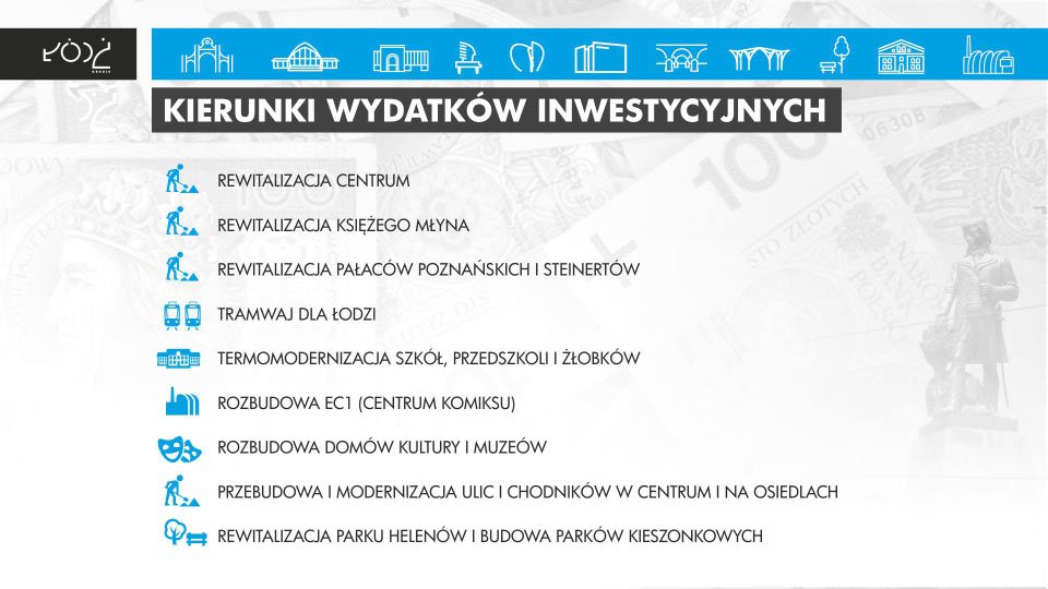 Główne kierunki inwestycji w przyszłym roku to oczywiście rewitalizacja centrum, Księżego Młyna oraz pałaców, ale także program Tramwaj dla Łodzi, termomodernizacje szkół i przedszkoli, rozbudowa EC1, domów kultury i muzeów, rewitalizacja parku Helenów oraz parków kieszonkowych.