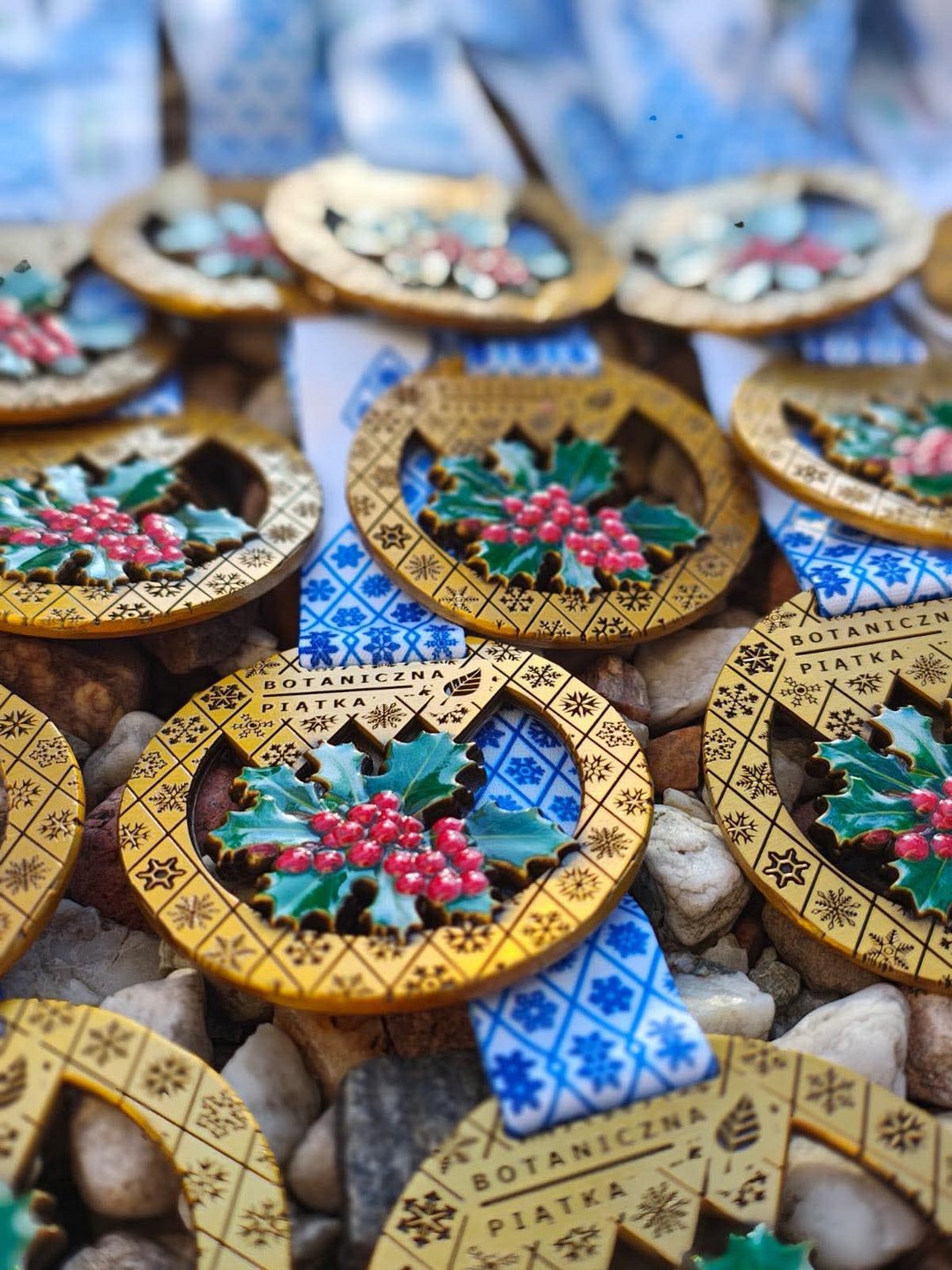 Zdjęcie przedstawia kolorowe medale w złotym kolorze z niebieską tasiemką. W centralnym punkcie medalu znajduje się zielony liść z owocami żurawiny.