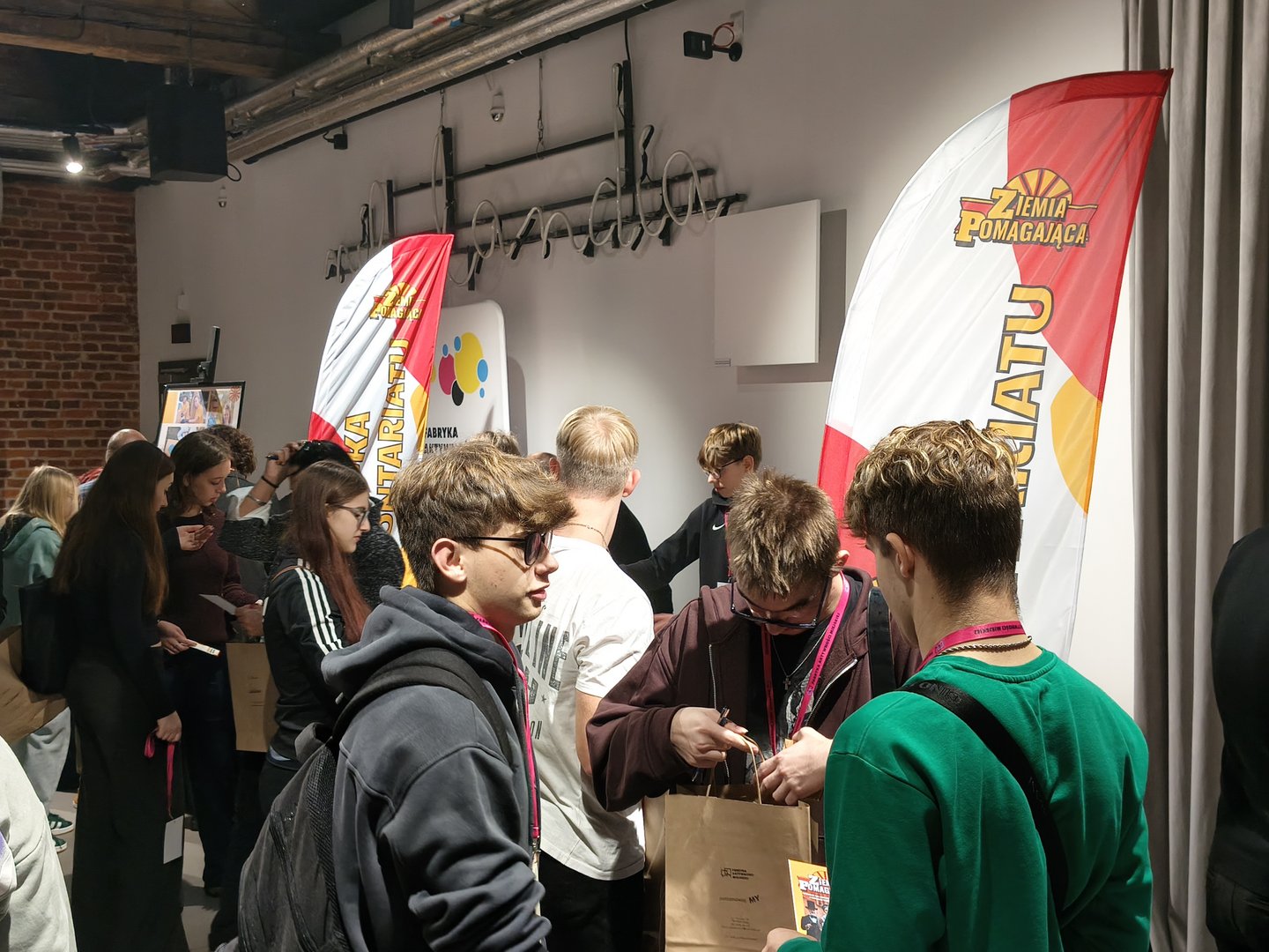Na zdjęciu widzimy grupy młodzieży po trzy, cztery osoby, które ze sobą rozmawiają. Za nimi widzimy windery w kolorach białym, żółtym, czerwonym z żółtym napisem Ziemia Pomagająca. W tle widzimy białą ścianę z punktami świetlnymi.