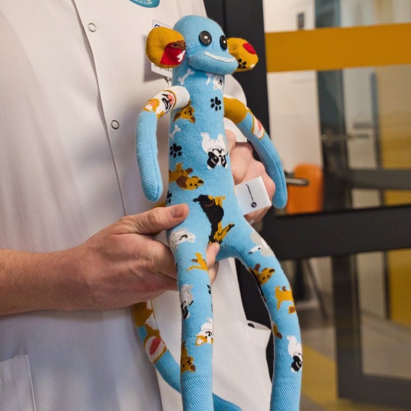 Na zdjęciu osoba w białym fartuchu trzyma miękką zabawkę. Zabawka jest jasnoniebieska, ma bardzo długie ręce i nogi, duże czarne oczy i uśmiech. Materiał ozdobiony jest wzorami psów, a uszy są kolorowe. Tło wygląda jak jasny korytarz z przeszklonymi drzwiami.